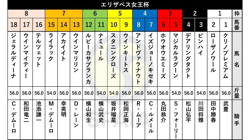 1 day agoエリザベス女王杯 枠順確定 レース傾向 ①人気 3番人気が好成績 ②脚質 逃げ先行馬が優勢 ③枠順 内外極端な枠が好成績128枠 ④血統 父キンカメディープ系. 自信の最終予想 ーーーーーーーーーーーー 公式line無料で 配信になります こちらです LINE 登録はこちら.
